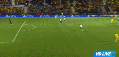 第45分钟,队友禁区中央挑传,布隆贝格小角度兜射右下角破网,2-0!