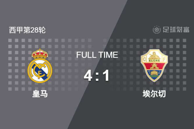 最终全场比赛结束,皇马主场4-1完胜埃尔切。