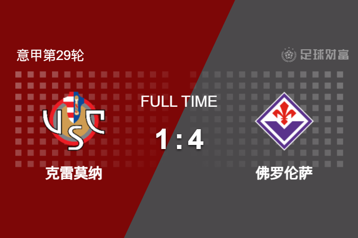最终全场比赛结束,佛罗伦萨客场4-1大胜克雷莫纳。