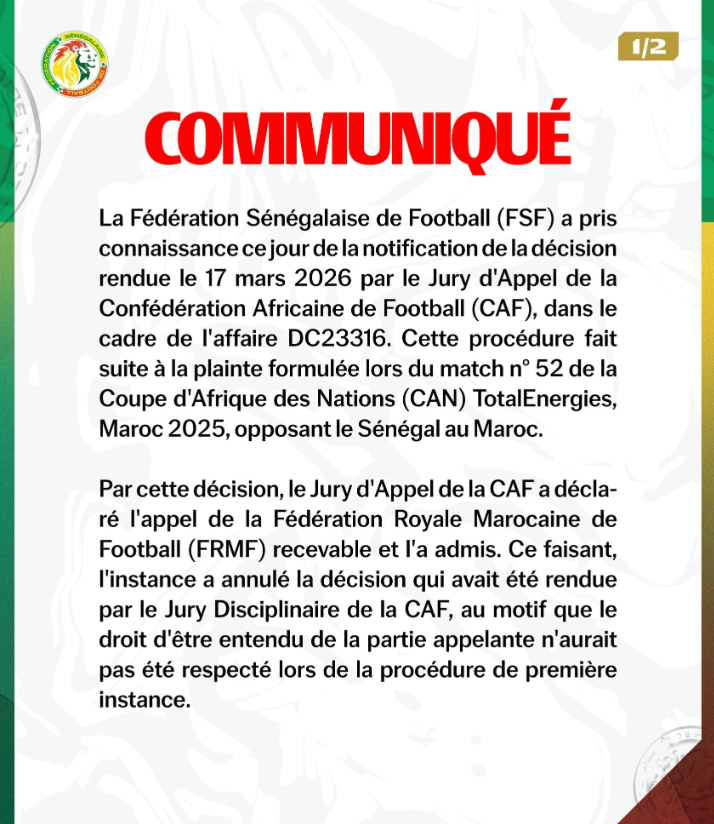 北京时间3月18日,塞内加尔足协官方发布公告,强烈谴责非洲足联将非洲杯决赛结果改判为0-3的裁决,称其“不公正、史无前例且不可接受”,并表示将立即向体育仲裁法庭提起上诉。