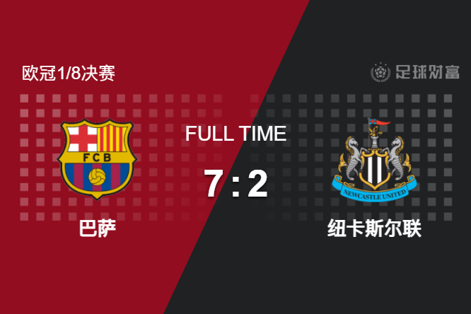 最终全场比赛结束,巴萨主场7-2血洗纽卡,总比分8-3晋级。