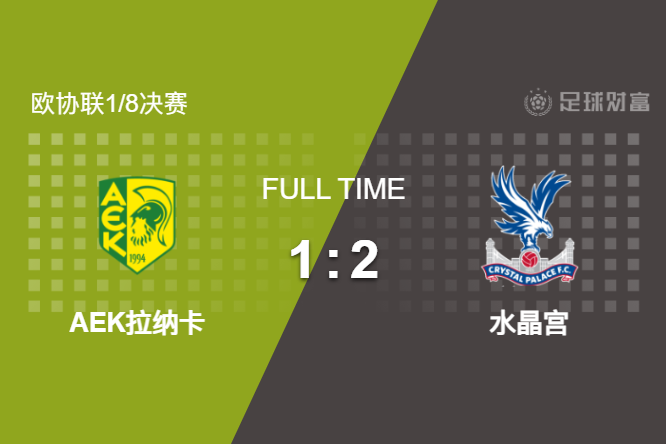 最终全场比赛结束,水晶宫客场加时赛2-1AEK拉纳卡,总比分2-1晋级八强。