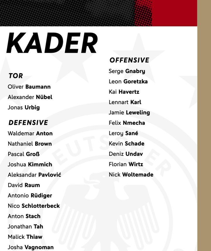 德国队公布大名单!维尔茨、哈弗茨、沃尔特马德领衔入选