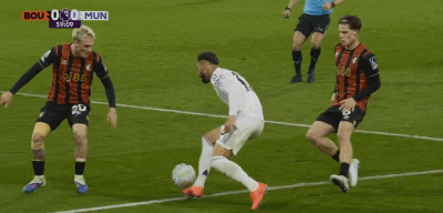 第70分钟,这不是点球吗?特吕费尔禁区内连拉带推放倒阿马德-迪亚洛,主裁判选择无视。