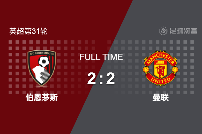 最终全场比赛结束,伯恩茅斯主场2-2战平十人曼联。