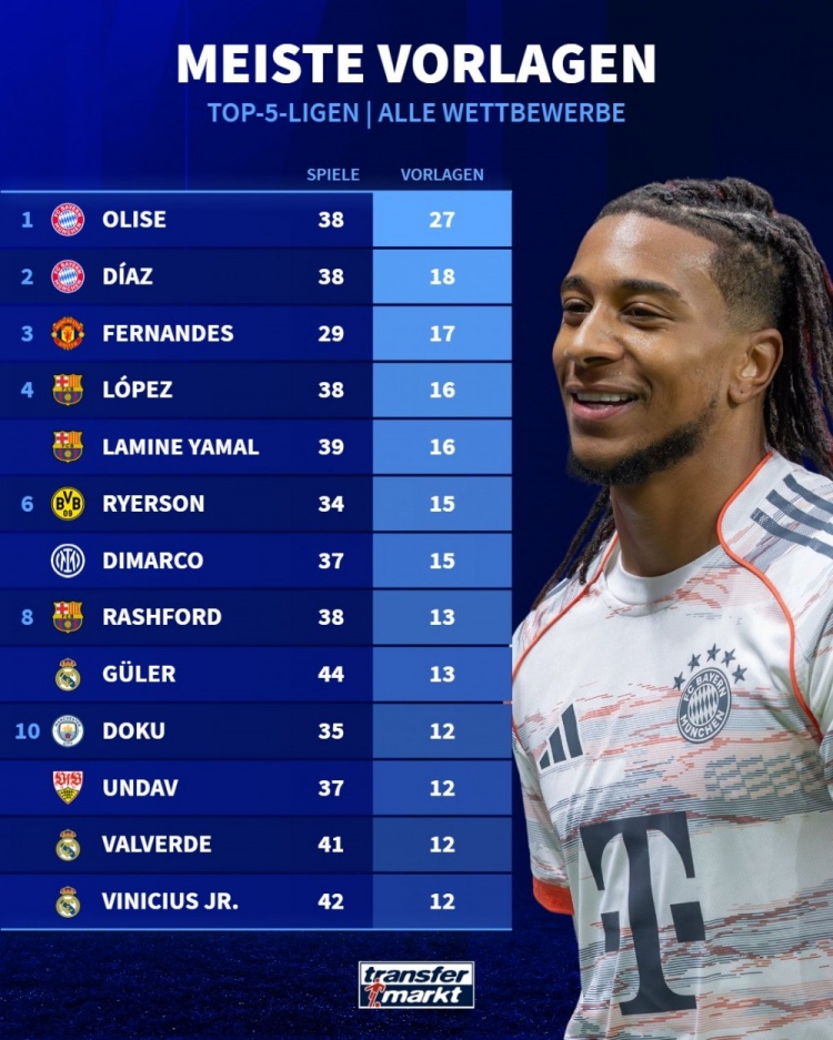 近日,德转统计了本赛季五大联赛球员各项赛事助攻榜,拜仁边锋奥利塞以38场27次助攻断层式领跑,成为五大联赛助攻王。奥利塞的队友迪亚斯以18次助攻位列第二,曼联核心B费29场17次助攻排名第三,巴萨双星费尔明(38场16助)和亚马尔(39场16助)并列第四。