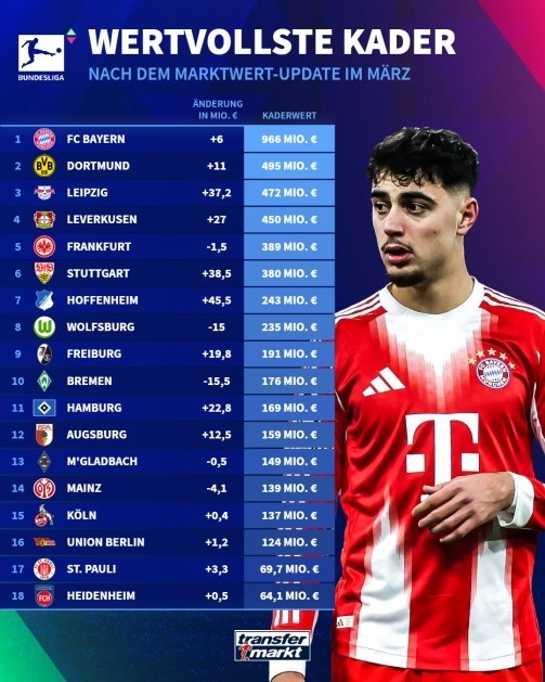 北京时间3月21日,德国转会市场更新了各支球队身价排名,其中拜仁以9.66亿居首,多特4.95亿第二,RB莱比锡第三。