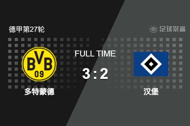 最终全场比赛结束,多特蒙德主场3-2逆转汉堡。