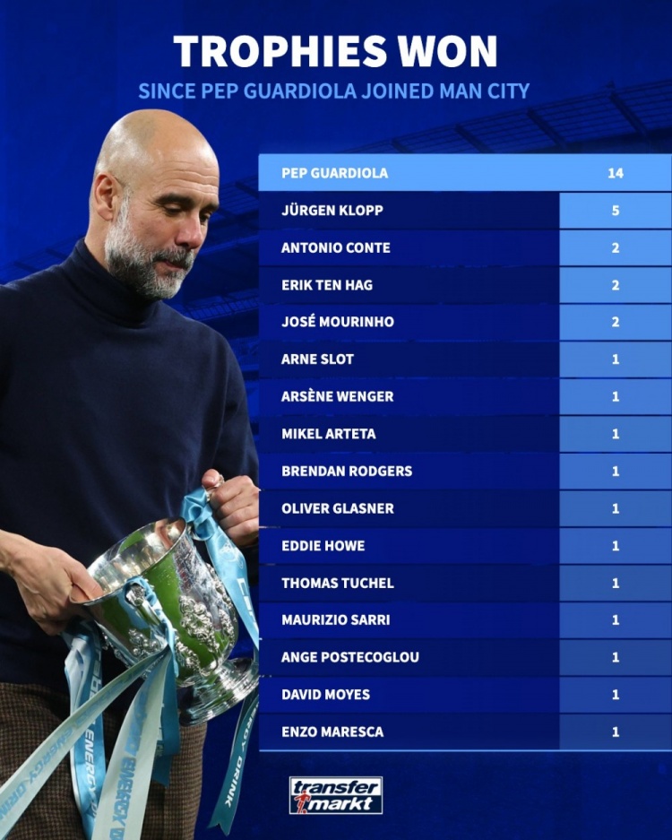 北京时间3月24日,德国转市场列出数据,本赛季英联杯是曼城主帅瓜迪奥拉执教球队第14座正式奖杯。