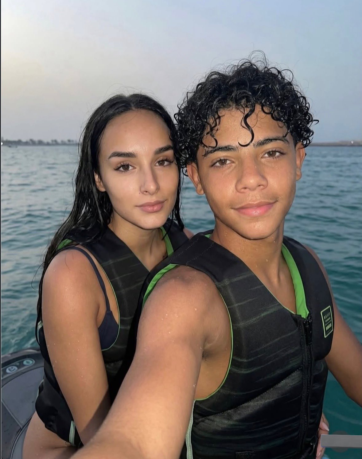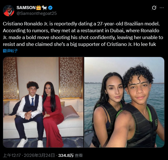 近日,国外网络上流传出一张C罗15岁儿子迷你罗与27岁巴西模特约会的照片。