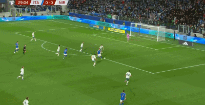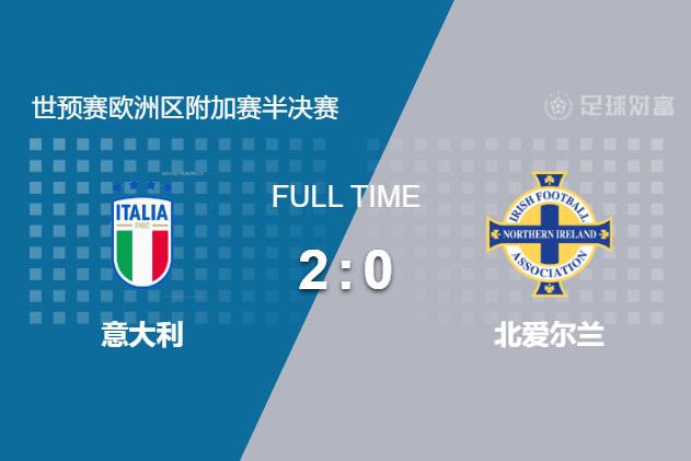 最终全场比赛结束,意大利2-0淘汰北爱尔兰晋级附加赛决赛,将与波黑争夺一张世界杯门票。