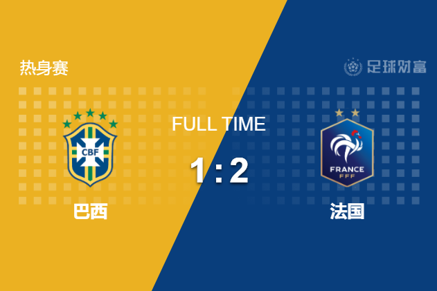 最终全场比赛结束,巴西1-2不敌10人法国。