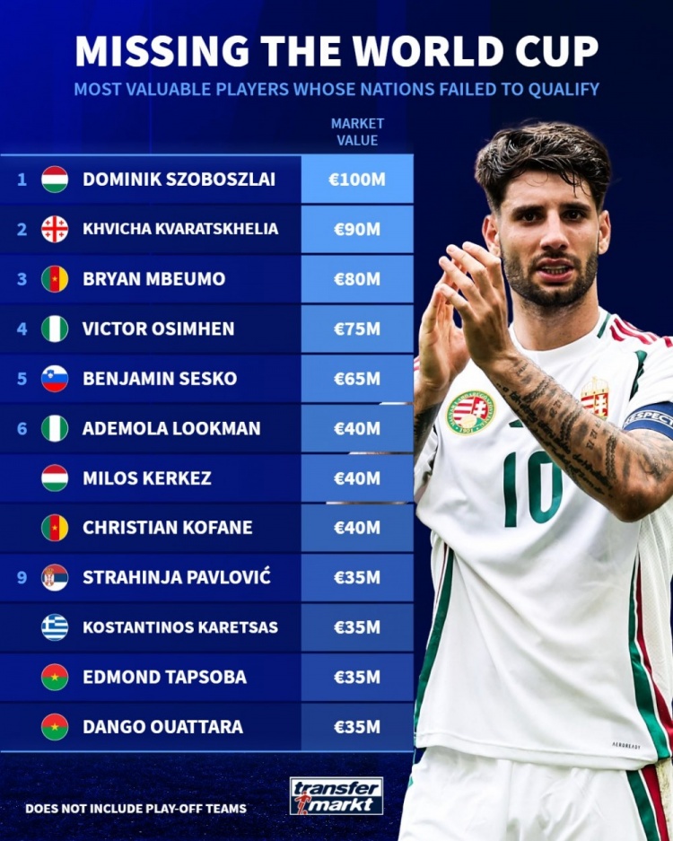 3月27日凌晨,世界杯欧洲区预选赛附加赛半决赛结束争夺,德转统计了无缘今夏世界杯的球员身价榜,匈牙利中场索博斯洛伊以1亿欧元的身价高居榜首,格鲁吉亚边锋克瓦拉茨赫利亚以9000万欧元位列第二。效力于布伦特福德的姆贝乌莫以8000万欧元排名第三。