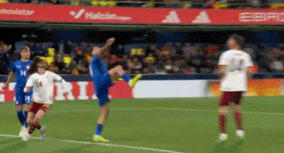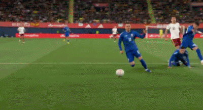 第16分钟,西班牙率先发难!费尔明禁区前沿斜传,巴埃纳故意一漏,奥亚萨瓦尔后插上左脚爆射入网,1-0!