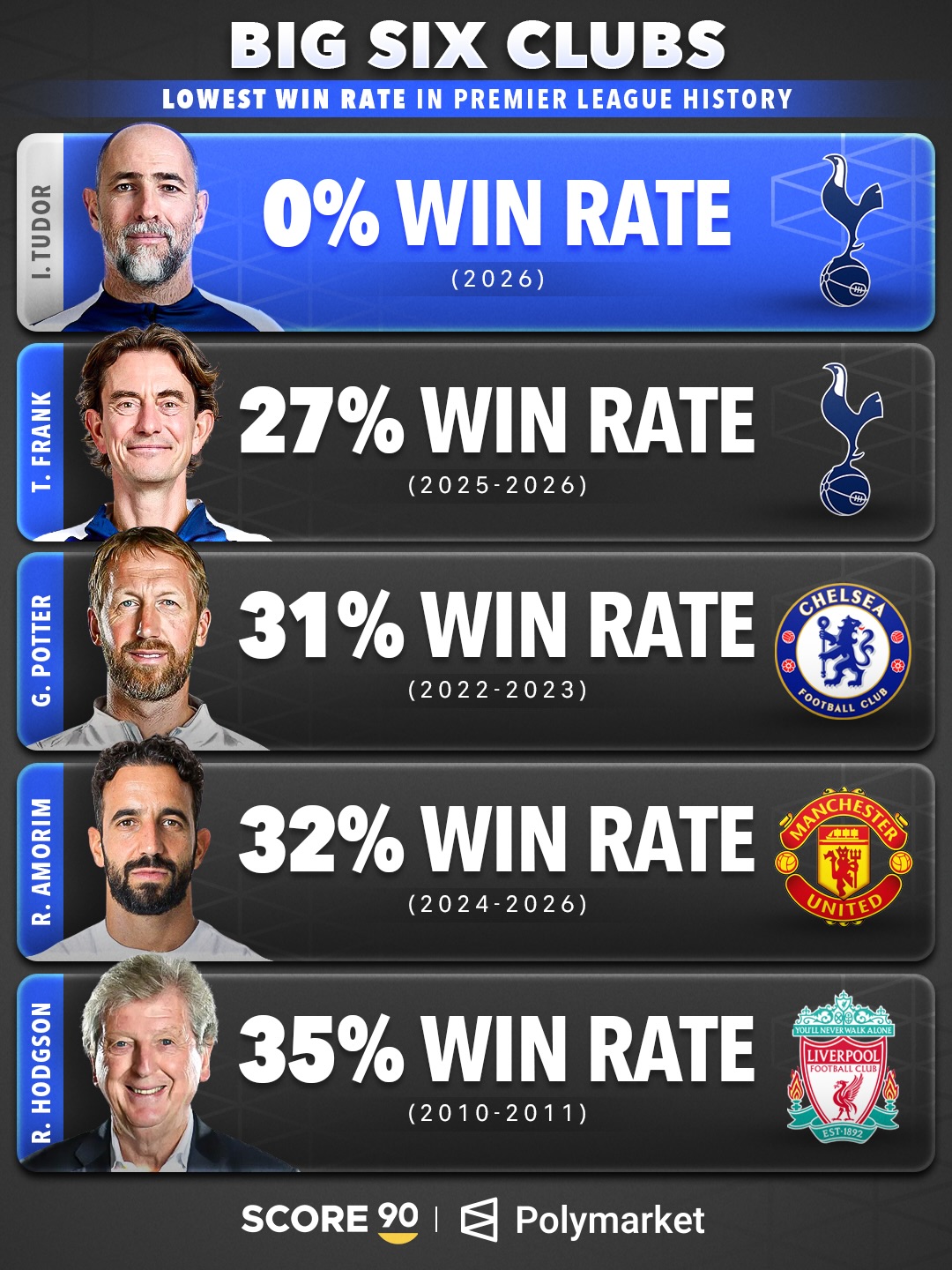 近日,英国媒体《Score90》统计出了英超BIG6历史上胜率最低的5名主帅,其中前热刺临时主帅图多尔以0%排名第一,第二名是同样来自热刺的弗兰克,前曼联主帅阿莫林排名第四。
