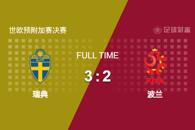 最终全场比赛结束,瑞典3-2战胜波兰,时隔8年重返世界杯。