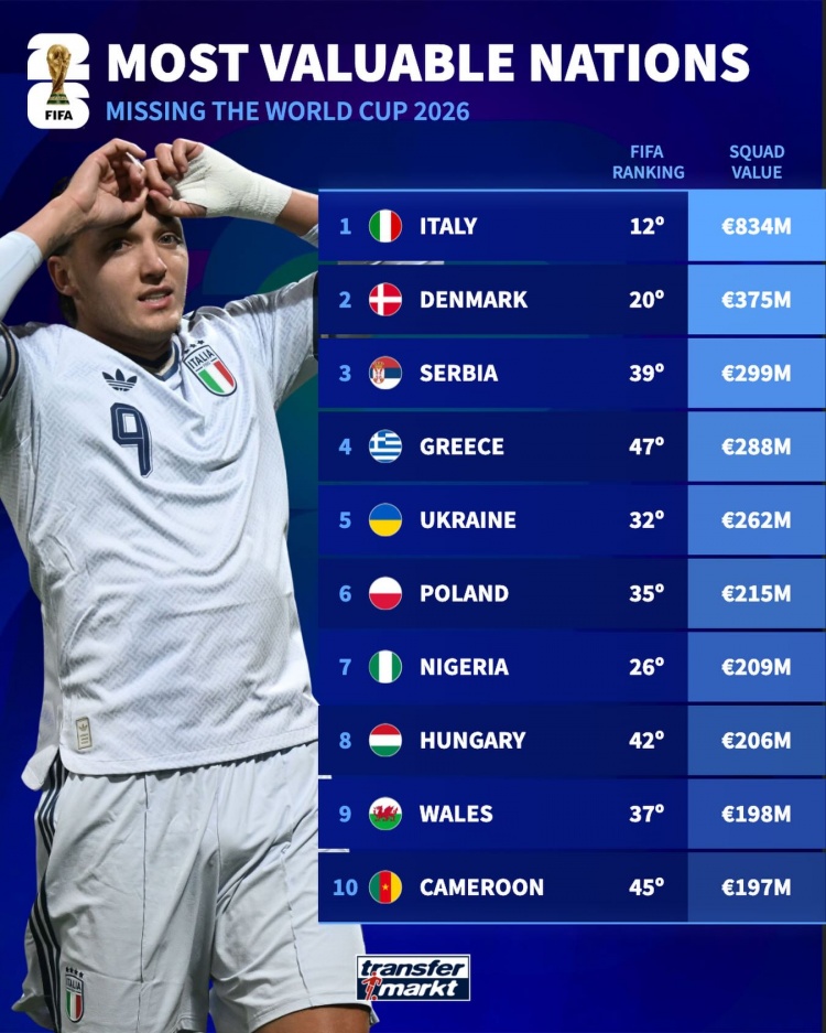 无缘世界杯国家队身价排名:意大利8.34亿居首,丹麦第二