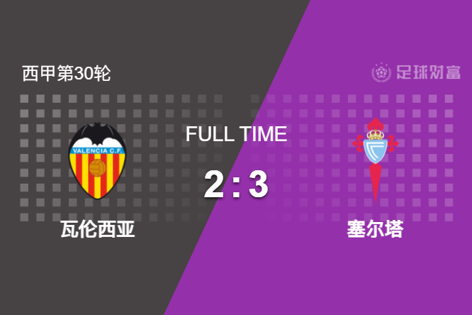 最终全场比赛结束,瓦伦西亚主场2-3塞尔塔。