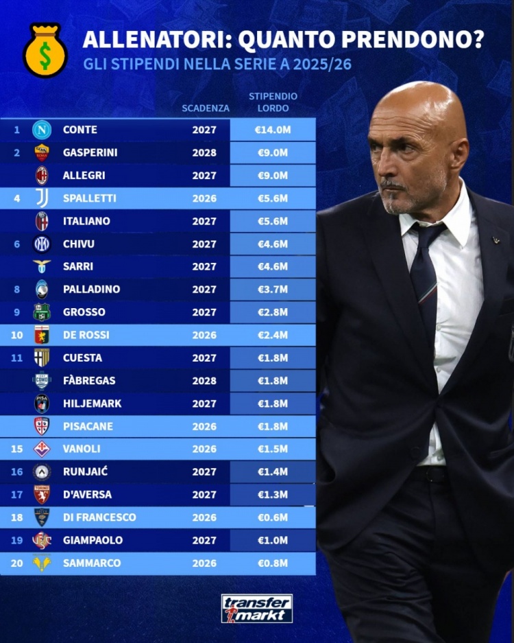 💰德转列意甲主帅年薪:孔蒂1400万居首,最低仅60万
