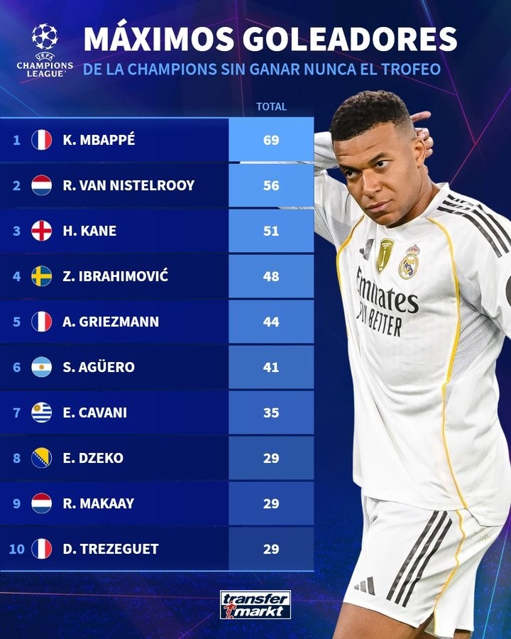 北京时间4月9日,德国转会市场统计出了从未赢过欧冠奖杯球员进球数排名,法国前锋姆巴佩以69球排名首位,凯恩51球排名第三位,伊布、阿圭罗等人悉数上榜。