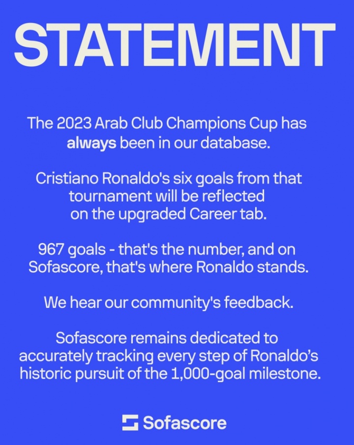 数据机构Sofascore近日发布公告,表示阿拉冠一直存在于其数据库中,C罗在那项赛事中的六个进球将体现在更新后的生涯一栏中,并强调“967个进球,就是这个数字”。