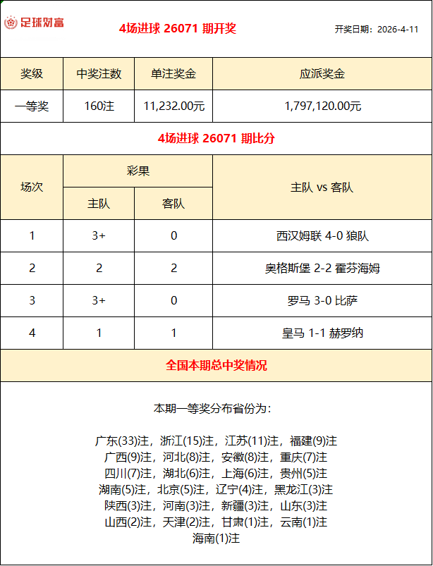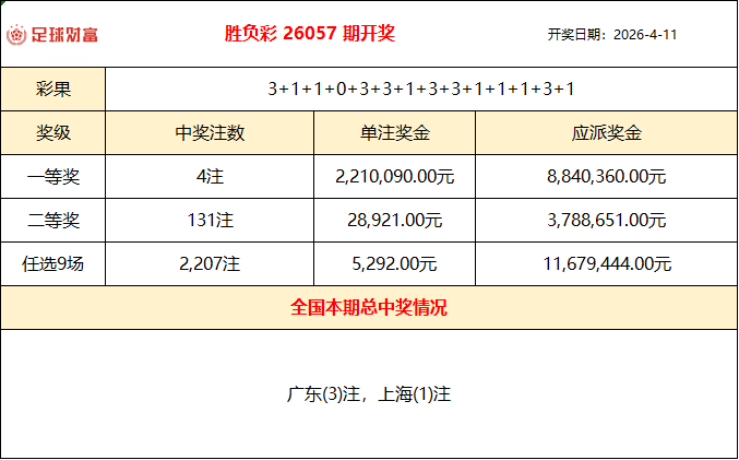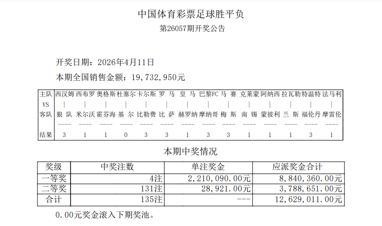 胜负彩26057期开奖:皇马1-1赫罗纳!头奖4注221万