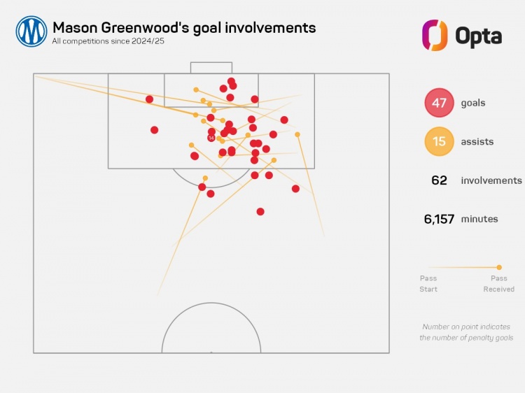 本赛季至今,格林伍德在各项赛事中为马赛出场40次,其中38次首发,已打入25球并送出10次助攻,成为欧洲五大联赛首位达成进球25+且助攻10+的球员。