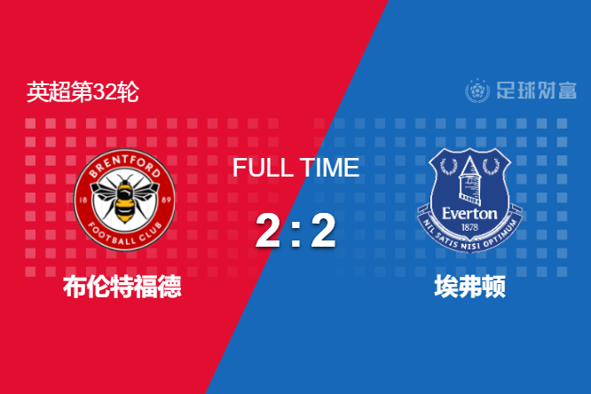 最终全场比赛结束,埃弗顿客场2-2绝平布伦特福德。