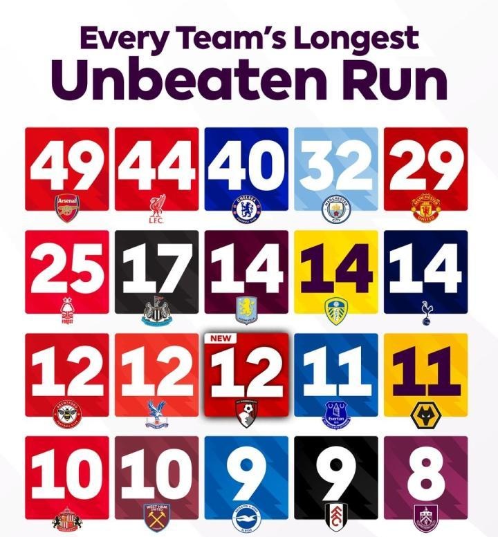 今天凌晨,伯恩茅斯客场2-1击败阿森纳,创造队史英超最长不败纪录。赛后,英超官方列出了英超20队历史最长不败纪录。阿森纳以49场高居榜首,利物浦44场紧随其后,切尔西40场排名第三。