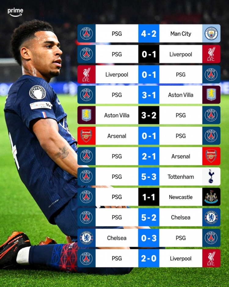 其中,巴黎唯一两场失利是上赛季0-1不敌利物浦,2-3不敌阿斯顿维拉,面对曼城、阿森纳、热刺、切尔西等豪门均取得全胜战绩。