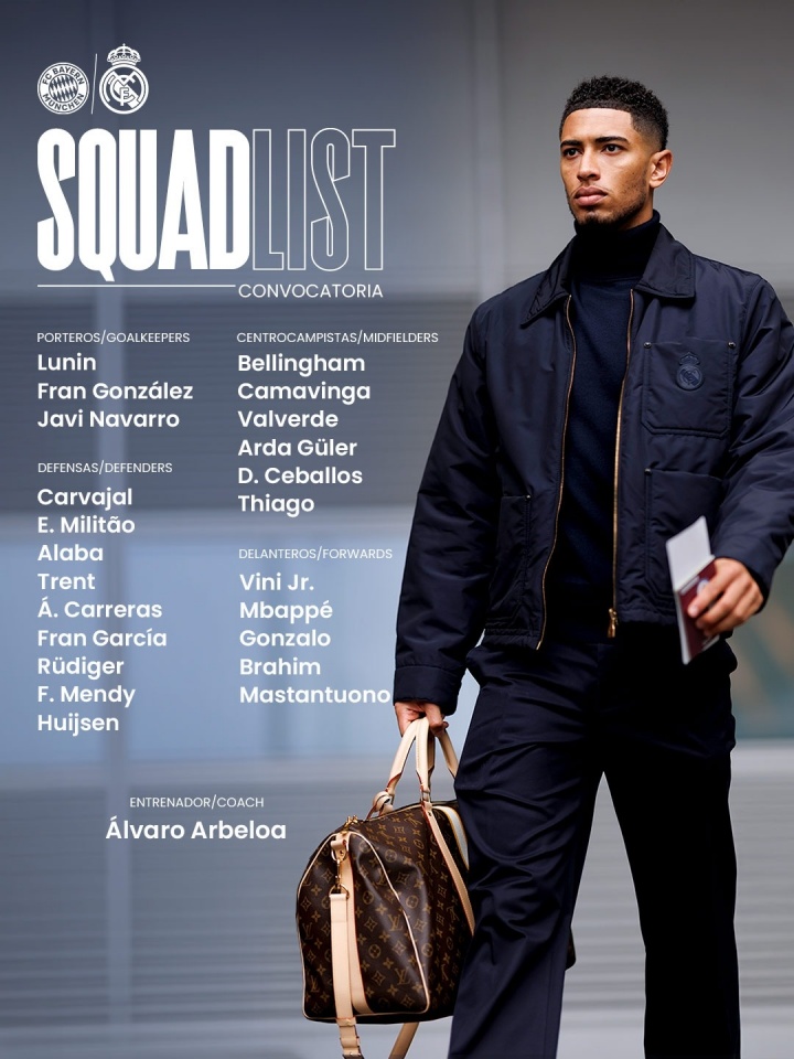 皇马公布vs拜仁名单:楚阿梅尼停赛,姆巴佩、维尼修斯领衔