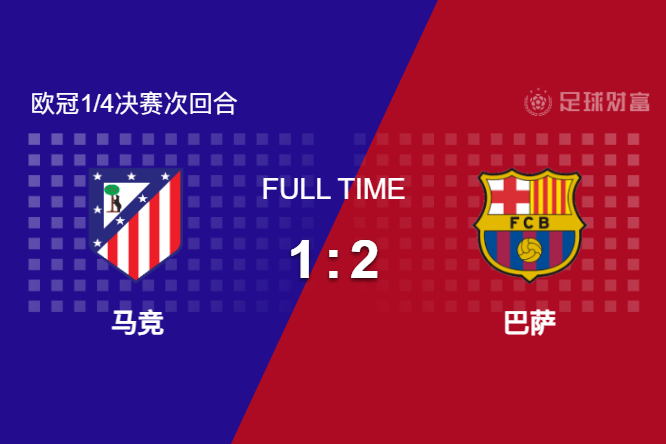 最终全场比赛结束,马竞主场1-2巴萨,总比分3-2晋级。