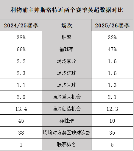 📉斯洛特两赛季英超对比:胜率下滑19%,输球率暴涨20%