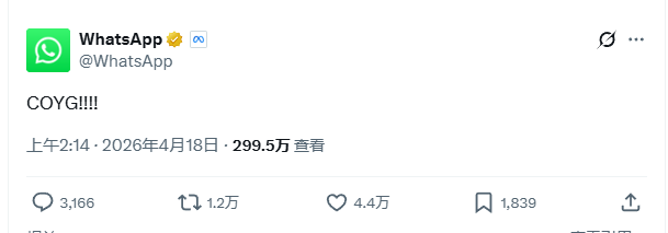 北京时间4月19日,英超联赛第33轮,曼城将在主场迎战阿森纳,赛前WhatsApp官方社媒写道:“COYG!!!!”,为枪手加油。(COYC意思:Come On You Gunners,加油枪手们!)