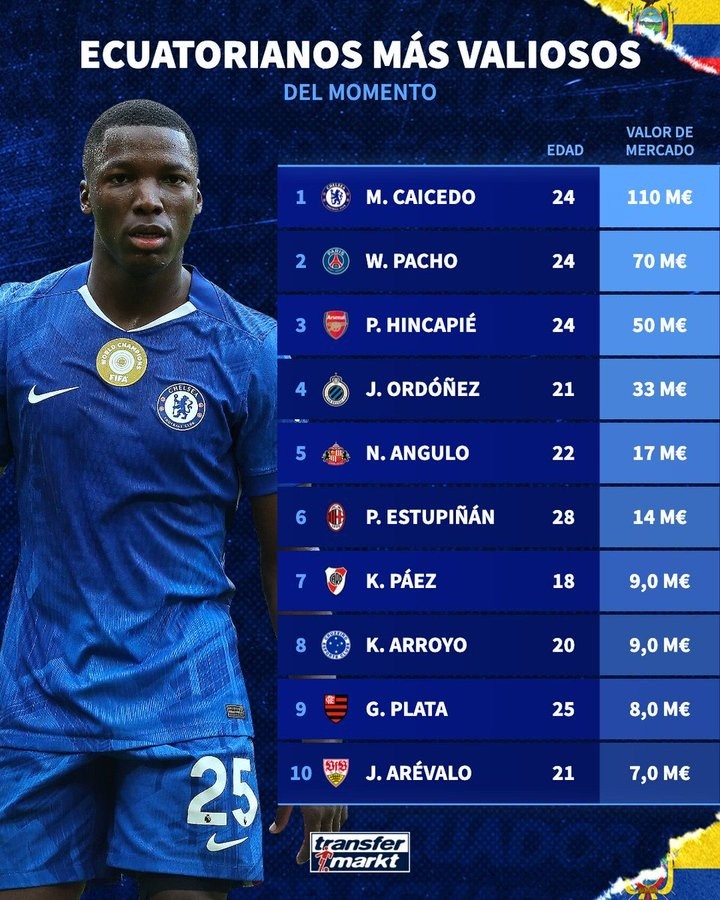 近日,德转统计了厄瓜多尔球员最新身价榜,切尔西后腰凯塞多以1.1亿欧元高居榜首,巴黎圣日耳曼后卫帕乔以7000万欧元排名第二,阿森纳后卫因卡皮耶以5000万欧元位列第三。