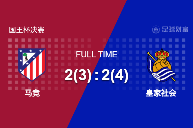 最终全场比赛结束,马竞2-2皇社,点球3-4失利,皇社捧起冠军奖杯。