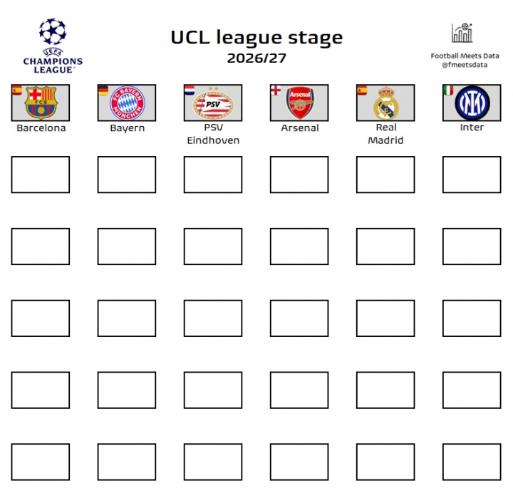 北京时间4月19日,Football Meets Data统计了已经有6支球队提前确定了2026/27赛季欧冠资格,分别是巴萨、拜仁、埃因霍温、阿森纳、皇马、国米,还有30个名额待定。