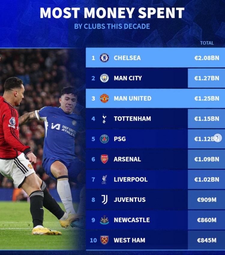 德国转会市场统计世界足坛2020年以来转会资金投入榜单,切尔西以20.8亿欧断层领先,前十中有8支英超球队,巴黎圣日尔曼、尤文图斯在列。