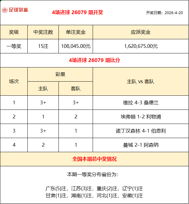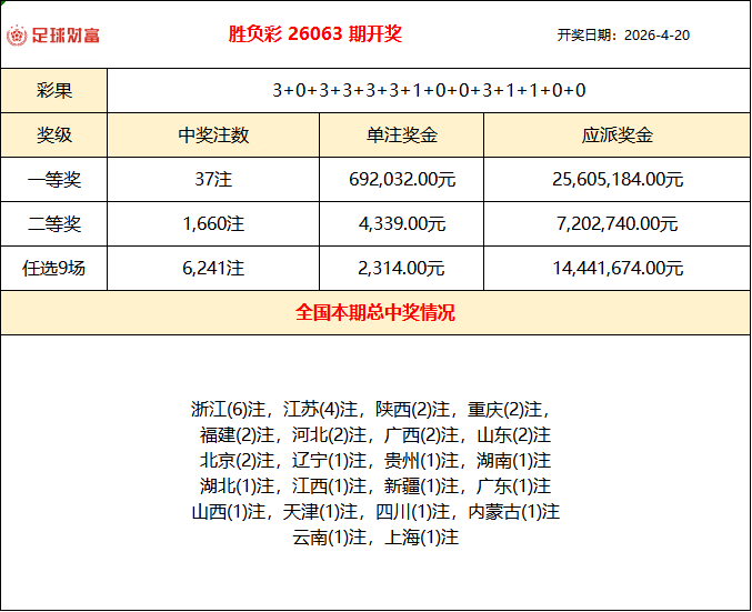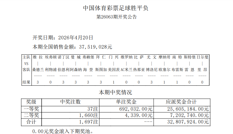 胜负彩26063期开奖:曼城2-1阿森纳!头奖37注69万