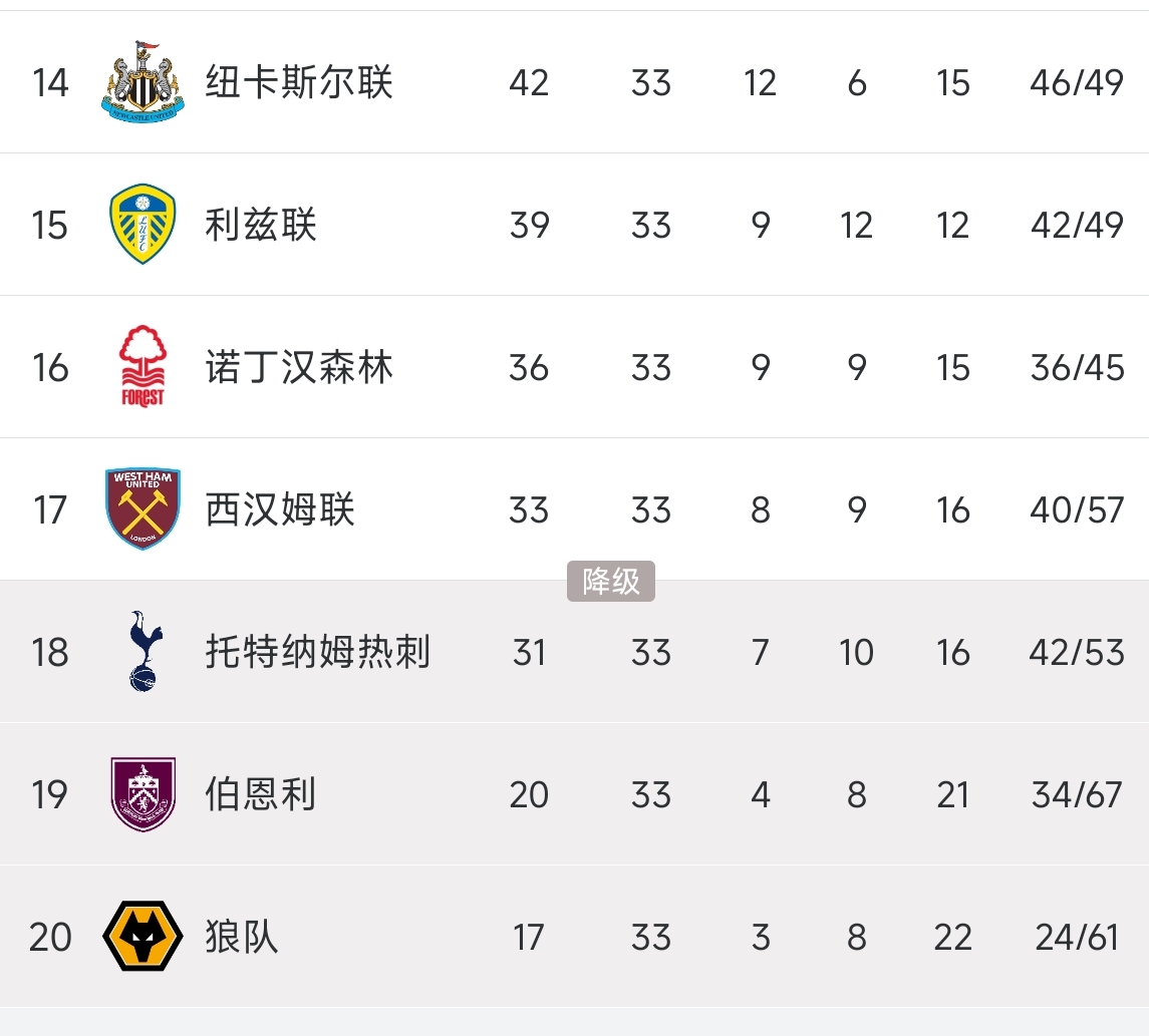 而另外一个降级名额则是在第15至18名的利兹联(39分)、诺丁汉森林(36分)、西汉姆联(33分)、热刺(31分)之间产生。