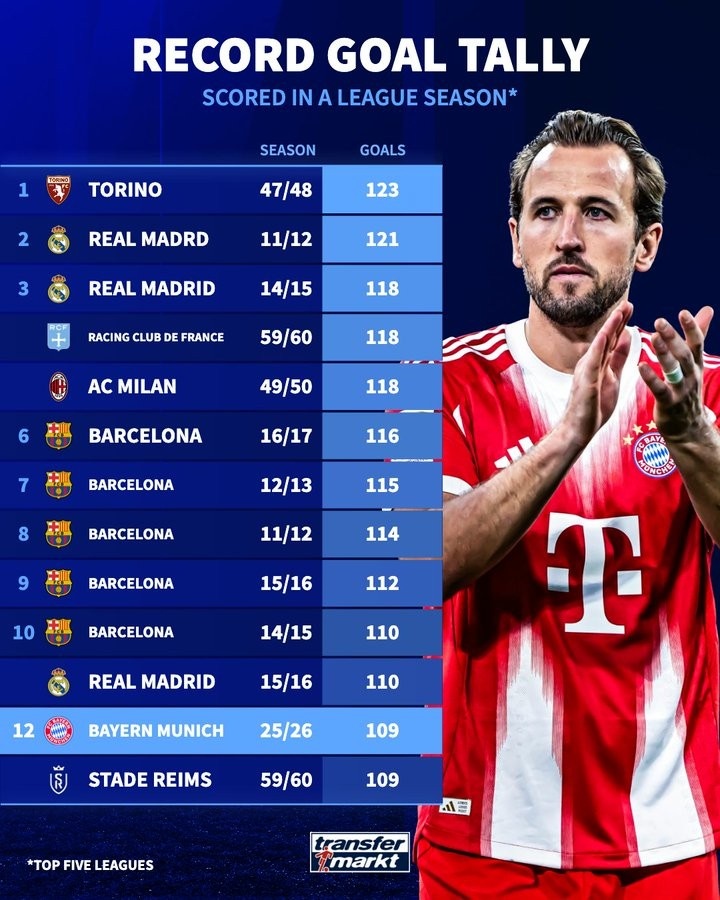 五大联赛单季进球纪录:都灵123球居首!拜仁本季有望前十