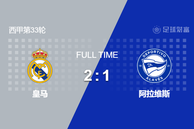 最终全场比赛结束,皇马主场2-1击败阿拉维斯。