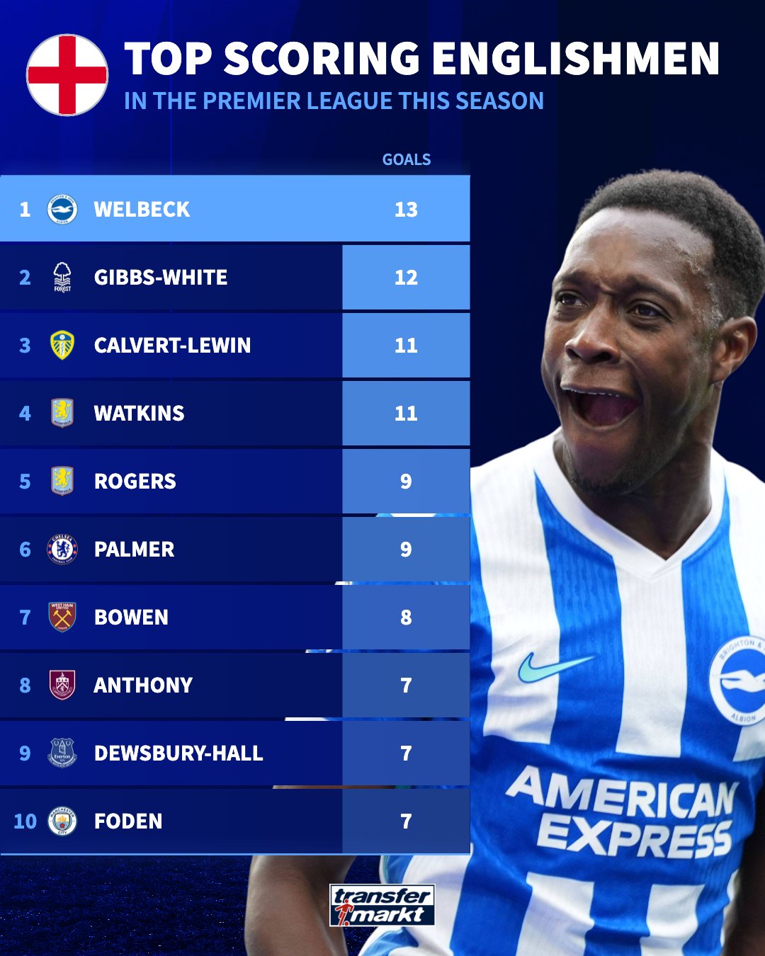 据最新数据统计,布莱顿前锋丹尼·维尔贝克以13粒进球高居英超本土射手榜首位,成为本赛季英超进球最多的英格兰球员。诺丁汉森林的攻击手吉布斯-怀特以12球排名第二,利兹联中锋勒温与阿斯顿维拉射手沃特金斯同以11球并列第三位。
