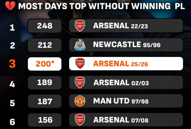 相关数据统计,在英超单赛季长期占据榜首却未能夺冠的球队中,阿森纳此前已经有过类似经历,并且枪手曾在2022/23赛季在榜首呆了248天却未夺冠,是联赛历史最多纪录,而本赛季他们占据榜首200天,或许将再次丢掉冠军。