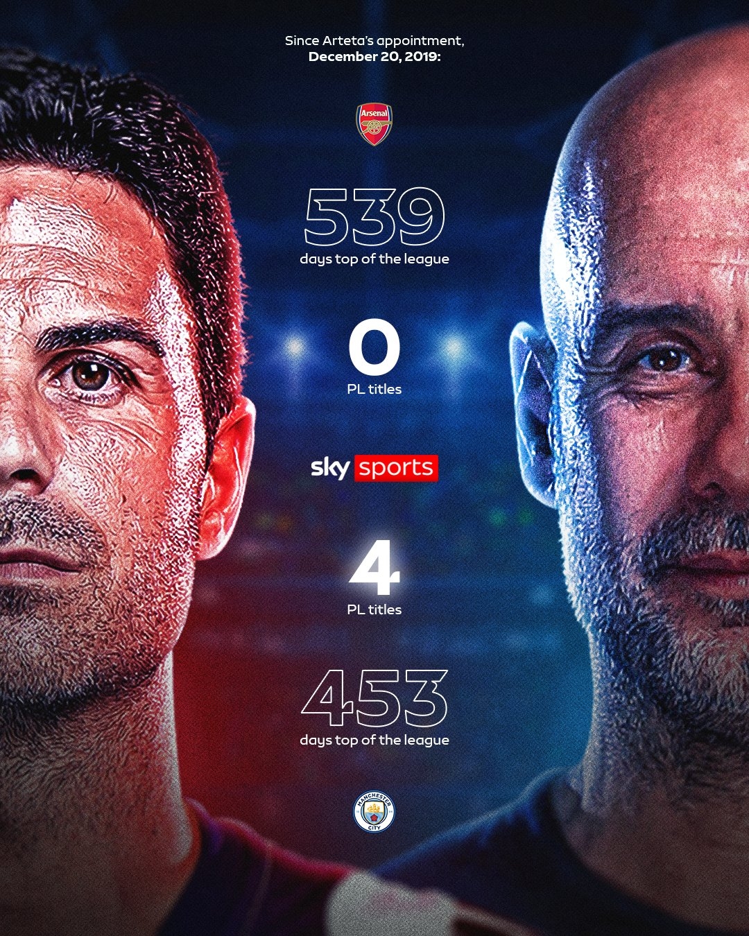 另外,阿尔特塔自2019年12月执教阿森纳以来,他已经在联赛榜首呆了539天却从未夺得过英超冠军,而瓜迪奥拉用453天的榜首夺得4座冠军。