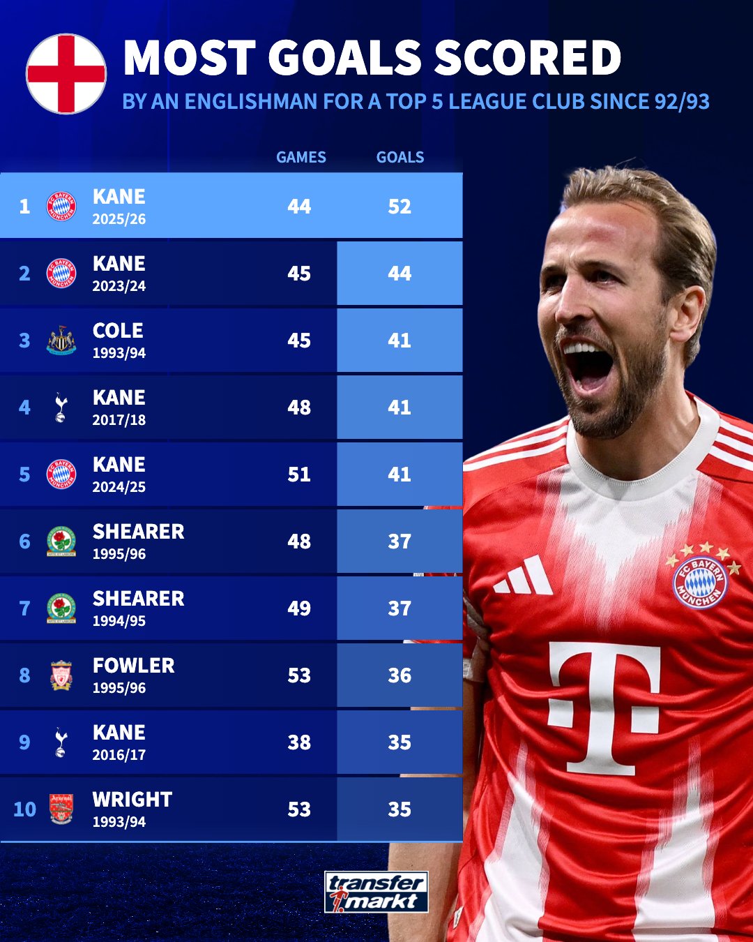 据德转最新数据统计,1992-93赛季至今英格兰前锋在五大联赛俱乐部单赛季进球榜单中,哈里·凯恩占据了统治地位。本赛季,凯恩仅用44场比赛就轰入52球,高居榜首。2023-24赛季的凯恩以45场44球位列第二,2017-18赛季凯恩48场41球排名第四,前五独占四席。