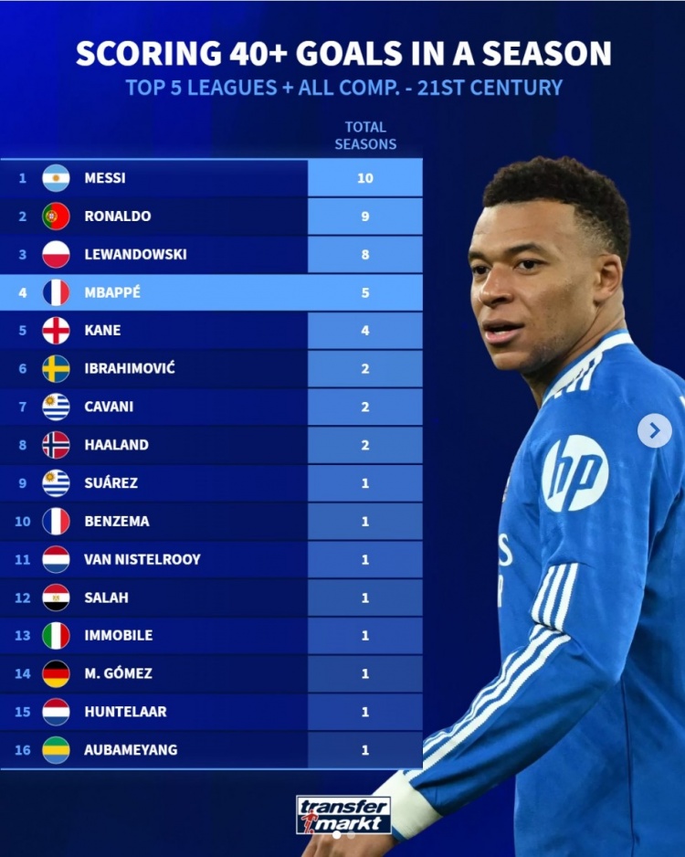 比肩传奇!姆巴佩4次单赛季进球40+,排名21世纪第4位