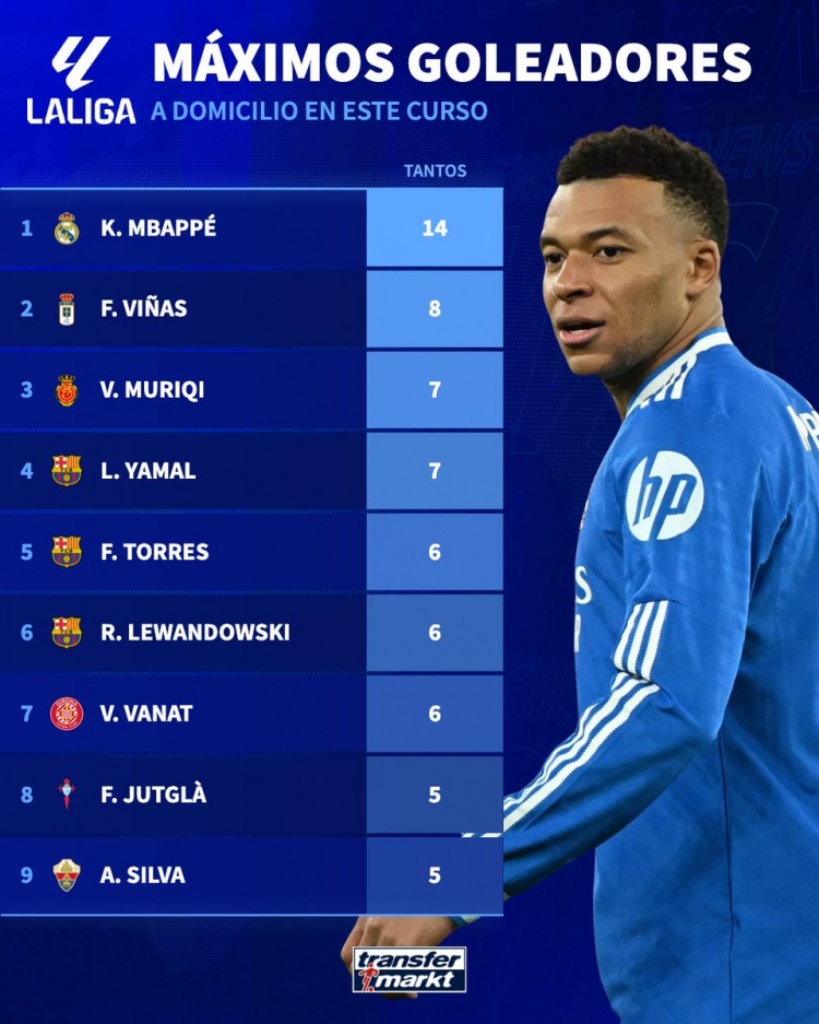 本赛季西甲客场射手榜:姆巴佩14球领跑,亚马尔7球