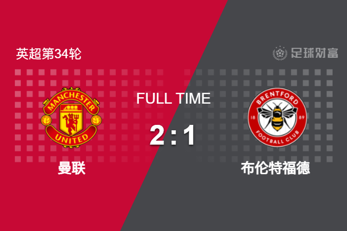 最终全场比赛结束,曼联主场2-1险胜布伦特福德。