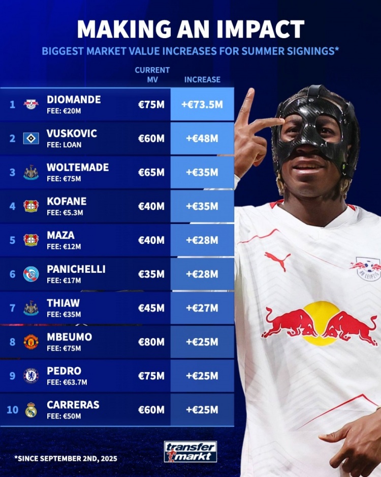 北京时间4月28日,德国转会市场更新了去年夏窗新援身价涨幅情况,莱比锡前锋扬·迪奥曼德上涨7350万欧元排名首位,武什科维奇4800万欧排名第二位。